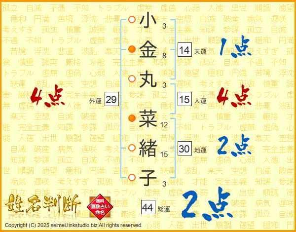 小(3画)金(8画)丸(3画) 菜(12画)緒(15画)子(3画)