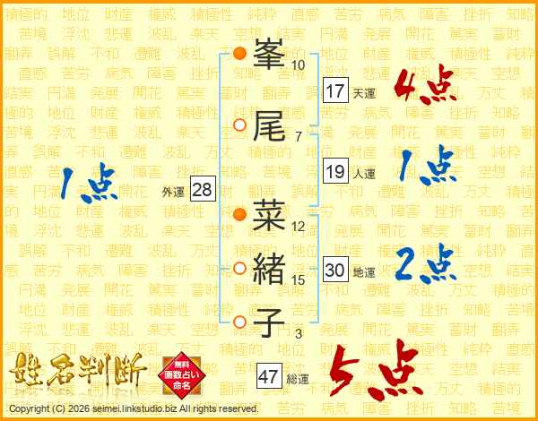峯(10画)尾(7画) 菜(12画)緒(15画)子(3画)