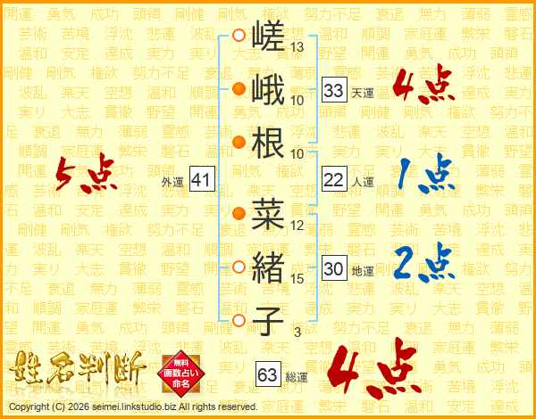 嵯峨根菜緒子さんの総運は63画の4点!