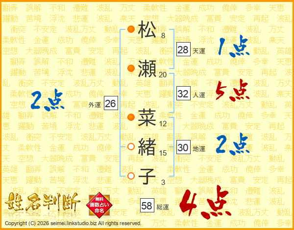 松(8画)瀬(20画) 菜(12画)緒(15画)子(3画)