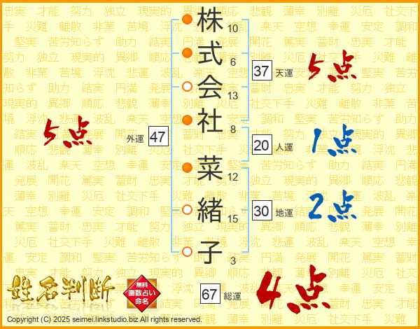 株(10画)式(6画)会(13画)社(8画) 菜(12画)緒(15画)子(3画)