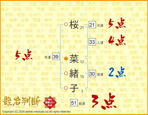 桜(21画) 菜(12画)緒(15画)子(3画)