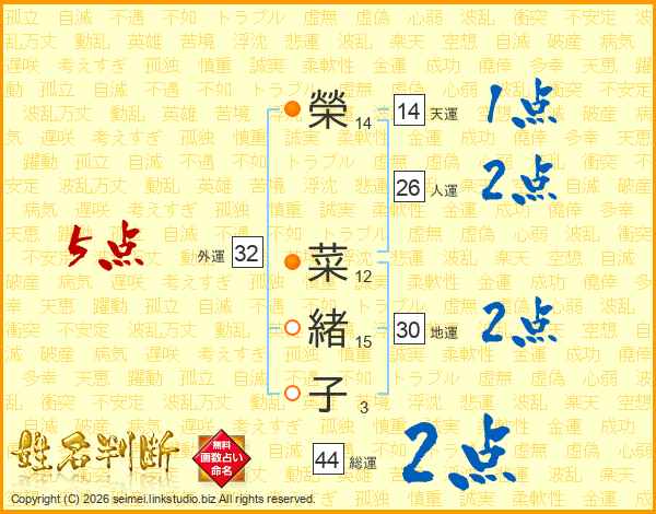 榮(14画) 菜(12画)緒(15画)子(3画)