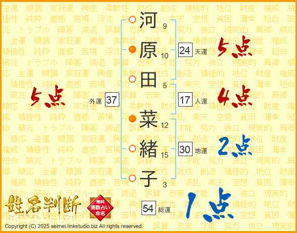 河(9画)原(10画)田(5画) 菜(12画)緒(15画)子(3画)