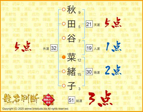 秋(9画)田(5画)谷(7画) 菜(12画)緒(15画)子(3画)