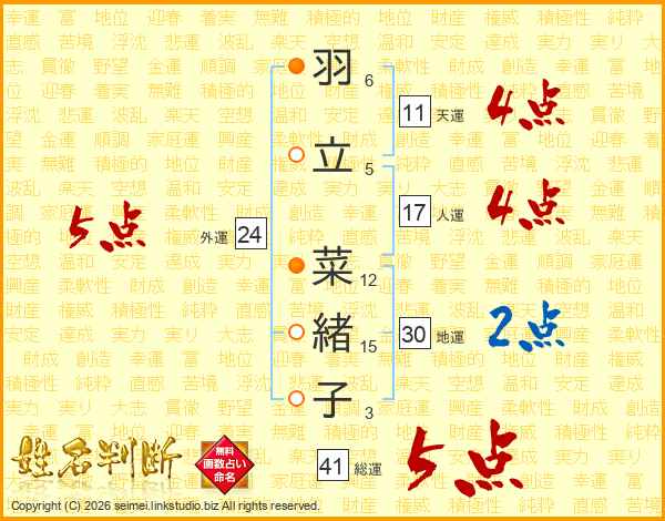 羽(6画)立(5画) 菜(12画)緒(15画)子(3画)