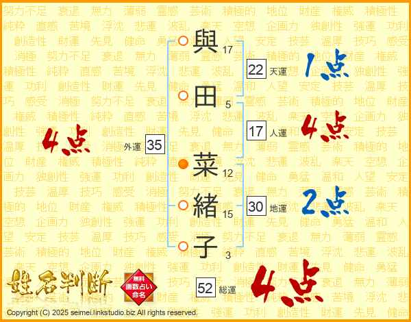 與(17画)田(5画) 菜(12画)緒(15画)子(3画)
