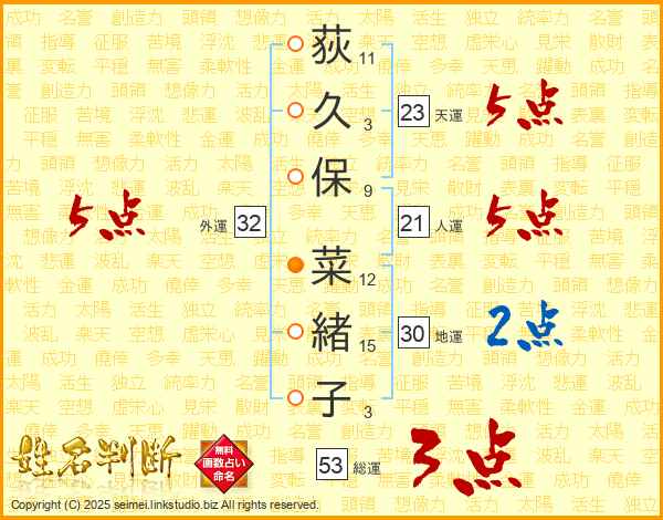 荻(11画)久(3画)保(9画) 菜(12画)緒(15画)子(3画)