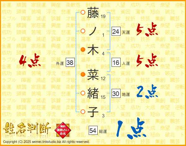 藤(19画)ノ(1画)木(4画) 菜(12画)緒(15画)子(3画)