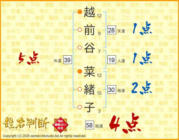 生活面を象徴する運勢です。外部から受ける影響力を表し、結婚運、家庭運や職場、環境への順応性を表します。総運から人運を引いた画数。姓や名が1文字の場合を除く。