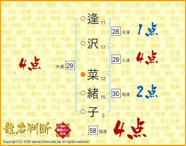 逢沢菜緒子さんの総運は58画の4点!
