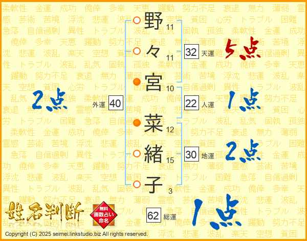 野(11画)々(11画)宮(10画) 菜(12画)緒(15画)子(3画)