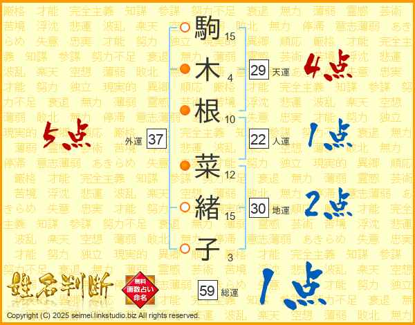駒(15画)木(4画)根(10画)  菜(12画)緒(15画)子(3画)