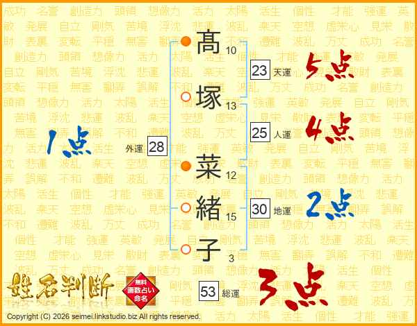 髙(10画)塚(13画) 菜(12画)緒(15画)子(3画)