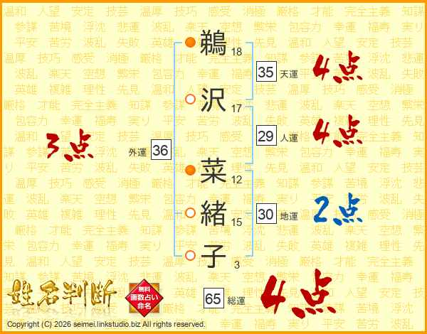 鵜沢菜緒子さんの総運は65画の4点!