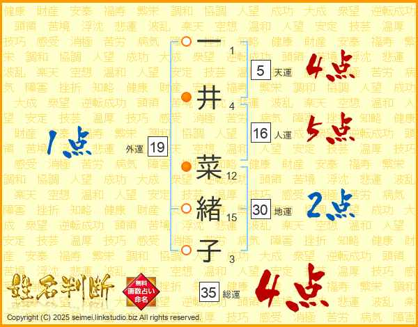一(1画)井(4画) 菜(12画)緒(15画)子(3画)