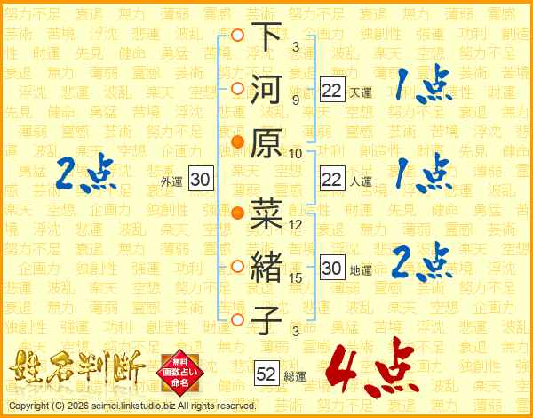 下河原菜緒子さんの総運は52画の4点!