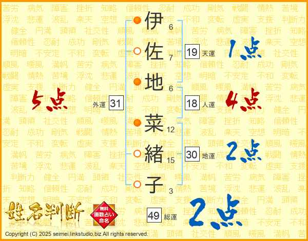 伊(6画)佐(7画)地(6画) 菜(12画)緒(15画)子(3画)