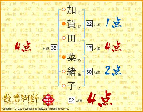 加(5画)賀(12画)田(5画) 菜(12画)緒(15画)子(3画)