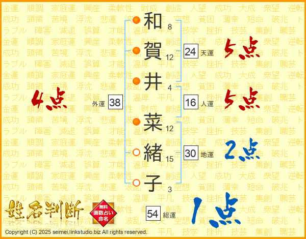 和(8画)賀(12画)井(4画) 菜(12画)緒(15画)子(3画)