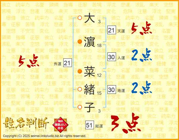 大濵菜緒子さんの天運は21画の5点!