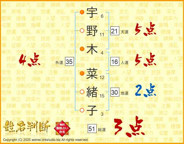 宇(6画)野(11画)木(4画) 菜(12画)緒(15画)子(3画)