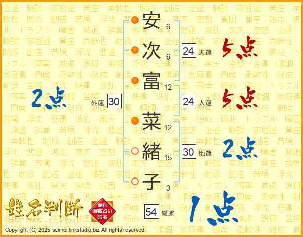 安(6画)次(6画)富(12画) 菜(12画)緒(15画)子(3画)