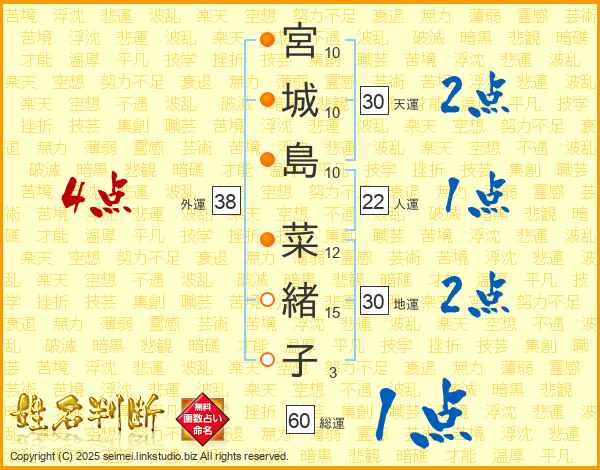宮(10画)城(10画)島(10画) 菜(12画)緒(15画)子(3画)