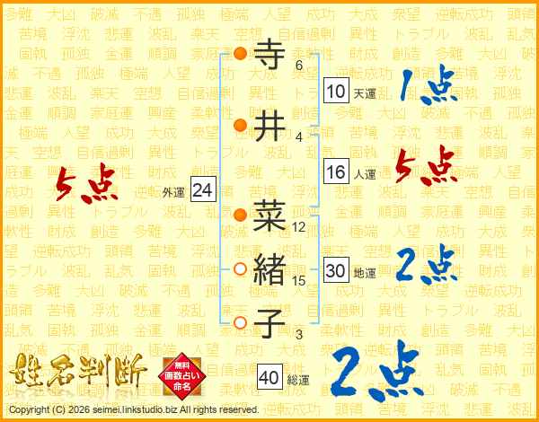 寺(6画)井(4画) 菜(12画)緒(15画)子(3画)