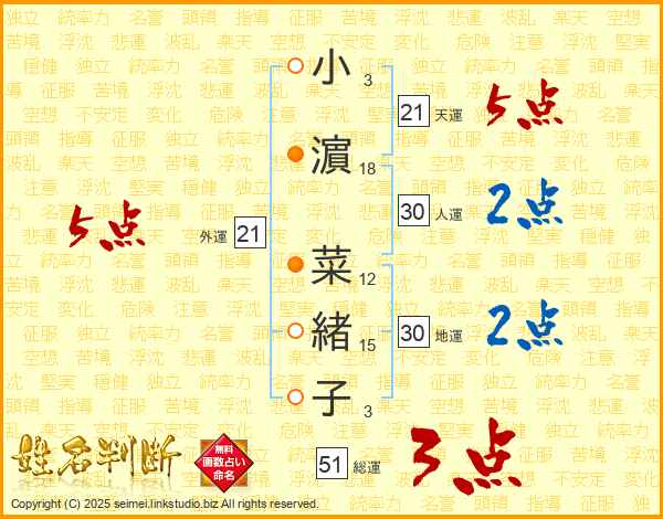 小(3画)濵(18画) 菜(12画)緒(15画)子(3画)