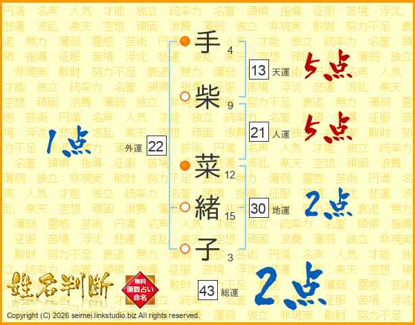 手(4画)柴(9画) 菜(12画)緒(15画)子(3画)