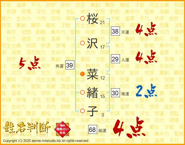 桜沢菜緒子さんの総運は68画の4点!