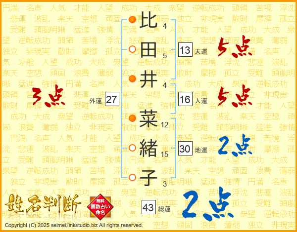 比田井菜緒子さんの総運は43画の2点!