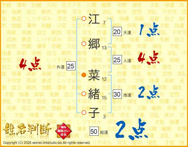 江(7画)郷(13画) 菜(12画)緒(15画)子(3画)
