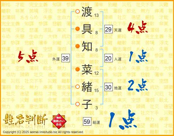 渡(13画)具(8画)知(8画) 菜(12画)緒(15画)子(3画)