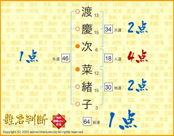 渡(13画)慶(15画)次(6画) 菜(12画)緒(15画)子(3画)