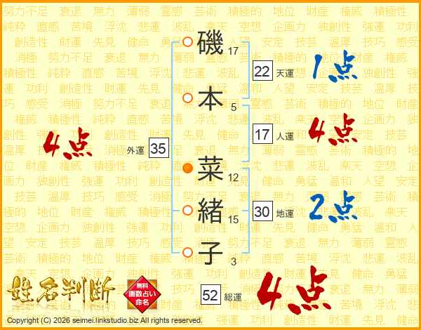 磯本菜緒子さんの総運は52画の4点!
