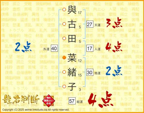與(17画)古(5画)田(5画) 菜(12画)緒(15画)子(3画)