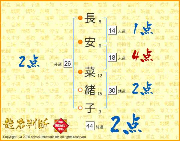 長(8画)安(6画) 菜(12画)緒(15画)子(3画)