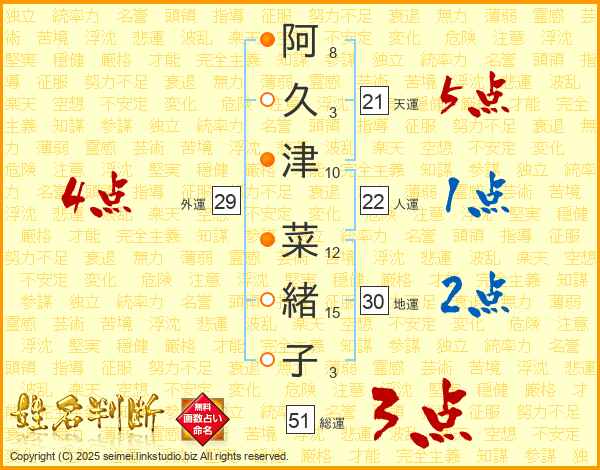 阿(8画)久(3画)津(10画) 菜(12画)緒(15画)子(3画)