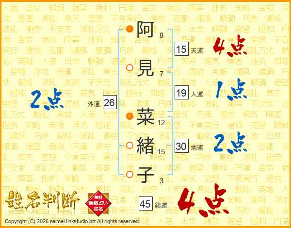 阿(8画)見(7画) 菜(12画)緒(15画)子(3画)