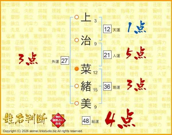 上(3画)治(9画) 菜(12画)緒(15画)美(9画)