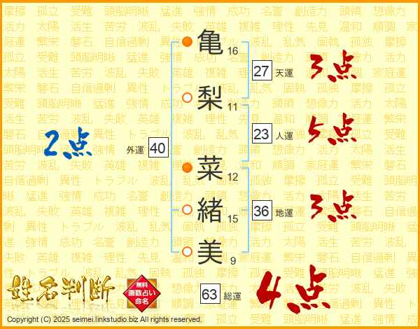 亀(16画)梨(11画) 菜(12画)緒(15画)美(9画)