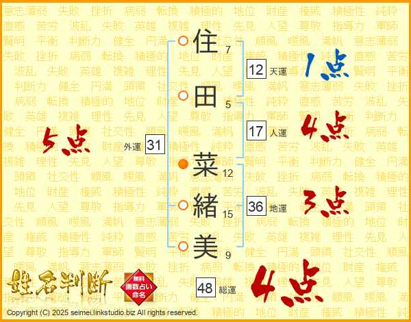 住(7画)田(5画) 菜(12画)緒(15画)美(9画)