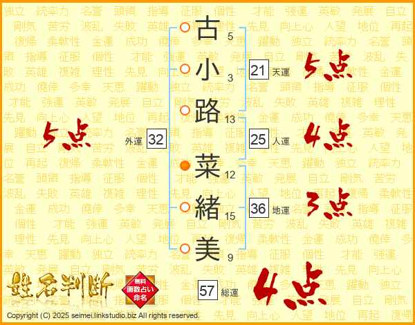 古(5画)小(3画)路(13画) 菜(12画)緒(15画)美(9画)