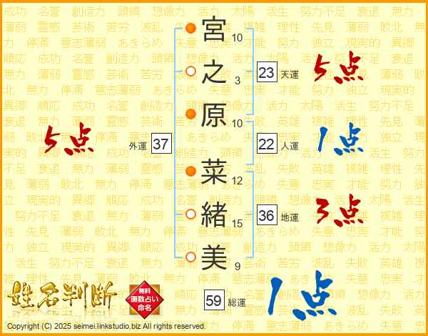 宮(10画)之(3画)原(10画) 菜(12画)緒(15画)美(9画)