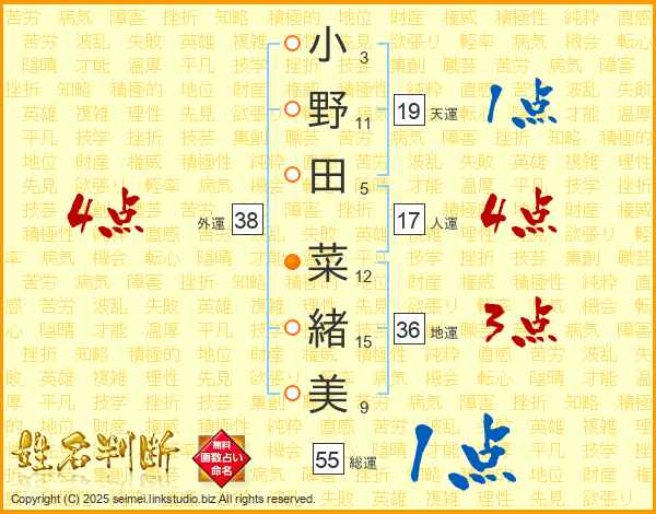 小(3画)野(11画)田(5画) 菜(12画)緒(15画)美(9画)