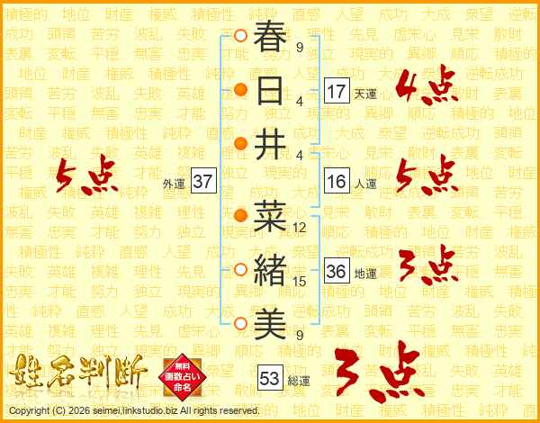 春(9画)日(4画)井(4画) 菜(12画)緒(15画)美(9画)