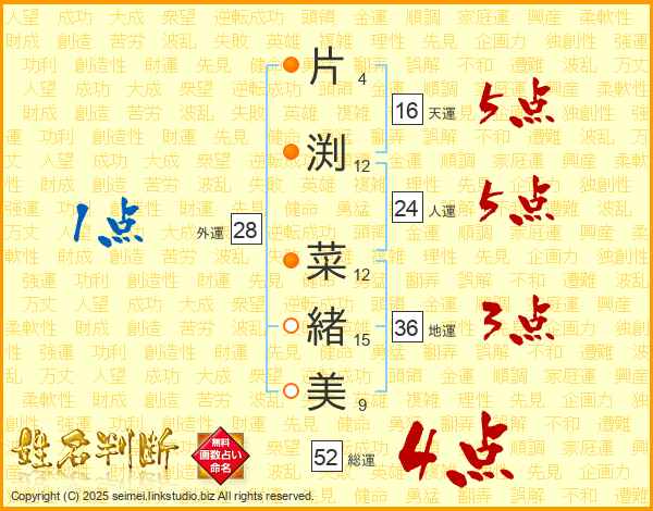 片渕菜緒美さんの総運は52画の4点!