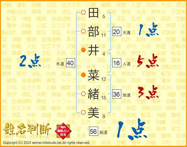 田(5画)部(11画)井(4画) 菜(12画)緒(15画)美(9画)